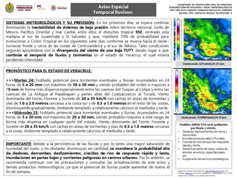 En los próximos días se espera que continúe dominando la inestabilidad de sistemas de baja presión sobre territorio nacional, Golfo de México, Pacífico Oriental y mar Caribe, entre ellos el disturbio tropical 95E, centrado esta mañana al sur de Guatemala y El Salvador y que mantiene 70% de probabilidad para evolucionar a ciclón tropical en los siguientes siete días conforme se mueva hacia el oeste-noroeste frente y cerca de las costas de Centroamérica y el sur de México. Tales condiciones seguirán apoyándose con la divergencia del viento de una baja TUTT, dando lugar a que continúe el temporal de lluvias y tormentas en el estado de Veracruz, el cual estaría perdiendo intensidad.